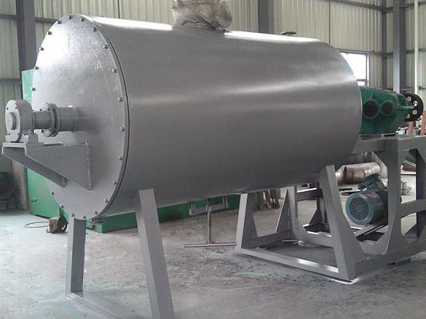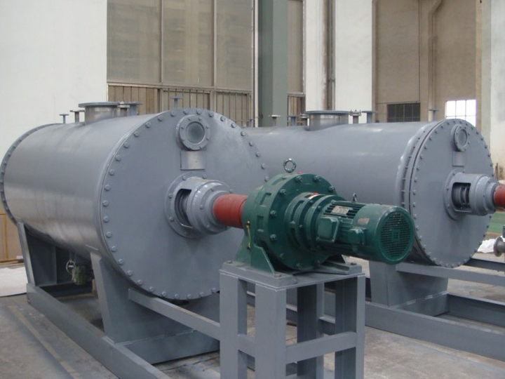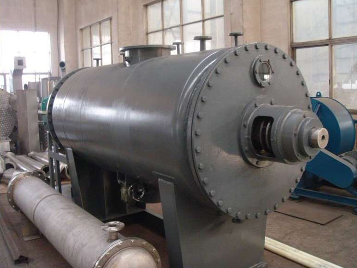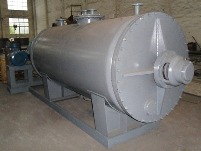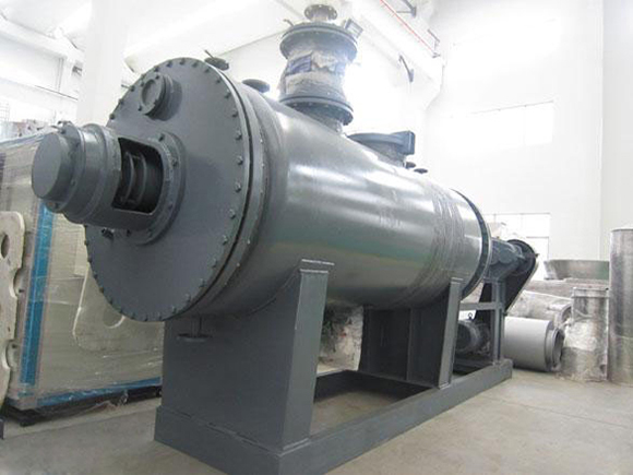 被干燥物料從殼體上方正中間加入,在不斷正反轉(zhuǎn)動(dòng)的耙齒的攪拌下,物料軸向來回走動(dòng),與殼體內(nèi)壁接觸的表面不斷替換,受到蒸汽的間接加熱,耙齒的均勻攪拌,粉碎棒的粉碎,使物料內(nèi)的水份氣化,在真空系統(tǒng)的作用下,使被干燥物料內(nèi)部水份和表面水份更有利的排出,氣化的水份經(jīng)干式除塵器、濕式除塵器、冷凝器,從真空泵出口處放空。
